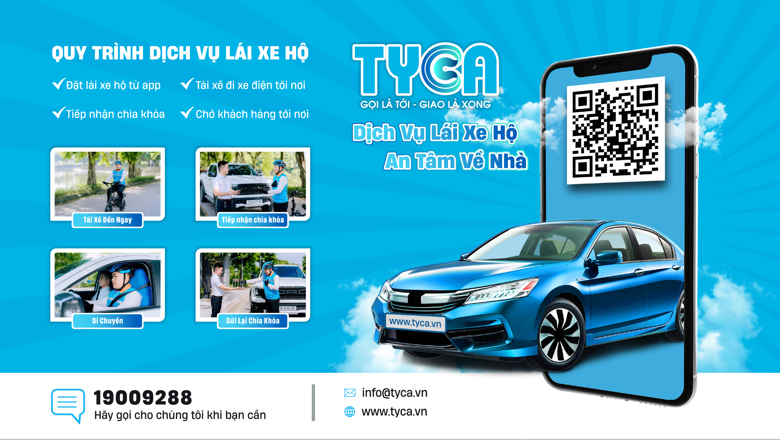 Đã vui hết mình, đừng lo đường về! Dịch vụ Lái xe hộ TYCA mang đến cho bạn sự an tâm tuyệt đối sau mỗi cuộc vui, buổi tiệc. Chỉ với vài thao tác đơn giản trên ứng dụng, tài xế chuyên nghiệp, lịch sự và đáng tin cậy của chúng tôi sẽ có mặt, trực tiếp lái xe của bạn về nhà một cách an toàn. Hãy tận hưởng trọn vẹn mọi khoảnh khắc, việc lái xe đã có TYCA lo.